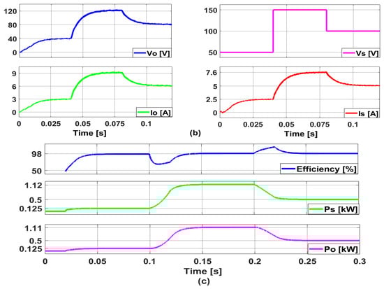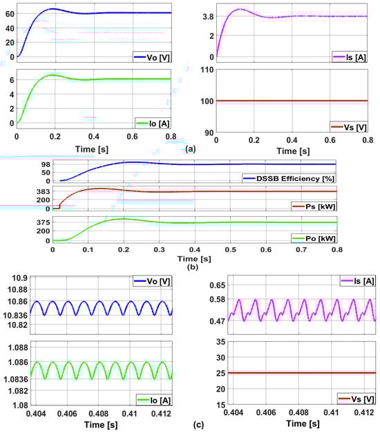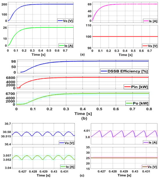 Figure 16. Simulated waveforms prepared in the environment of Simulink/MATLAB for the given designed DSSB specifications: (a) Output and input currents and voltages, (b) transient behavior of currents and voltages within small time scale, (c) Output and input power with efficiency.