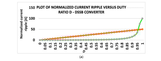 Figure 6a shows an illustration of the DSSB’s normalized inductor current ripple curves for various switching ratio D values. The normalized source current ripple ( i s = i 1 ) of the DSSB is represented by the brown line, and the output current ripple ( i o = i 3 ) is represented by the green line.