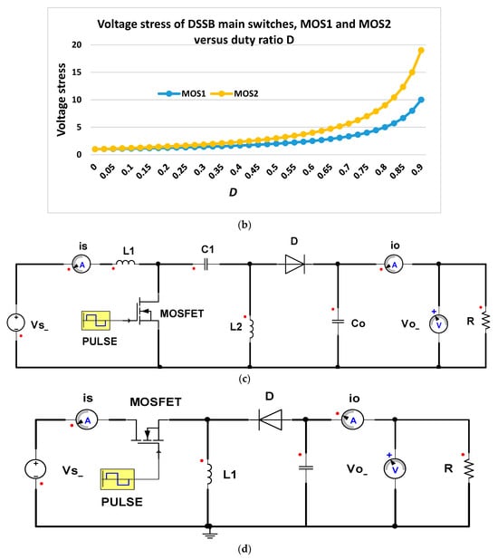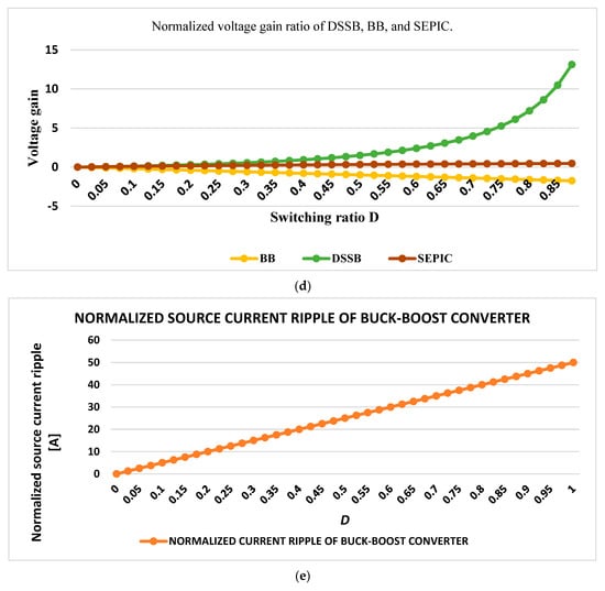 Figure 6. (a) A plot of the normalized inductor current ripples of the DSSB converter, (b). A plot of voltage stress of the DSSB’s main switches, MOS1 and MOS2, (c) A conventional SEPIC converter. (d) A switched-mode inverting buck-boost converter.