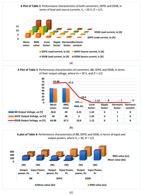 Hence, the output voltage magnitude in the bucking regime is less than that of the supply for 0 < D < 1 + 2 and otherwise, is greater than the supply. Therefore, the DSSB combines the capabilities of the buck and boost converters. The DSSB output and input voltages and currents in the bucking regime are shown in Figure 3a, while the output and input powers with a 98% converter efficiency are shown in Figure 3b. Figure 3c displays the steady-state DSSB voltages and currents waveforms to demonstrate the harmonic content produced in the currents and voltages at low frequency (1 kHz) and supply voltage (25 V).