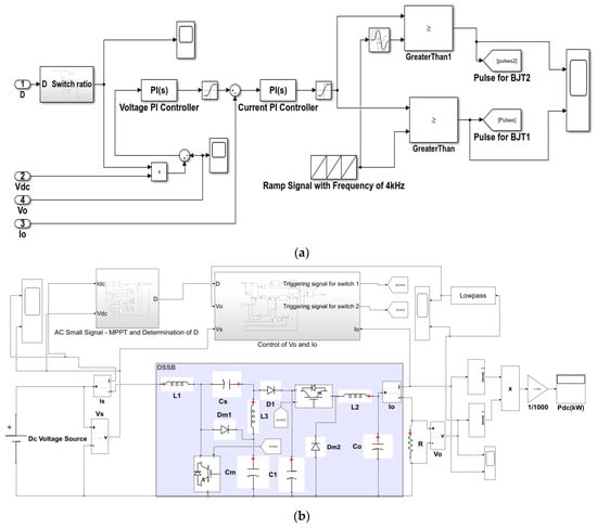 Figure 10. (a) DSSB Current-mode controller for controlling the load voltage and current, (b) MATLAB/Simulink implementation circuit block diagram for the DSSB with controllers.