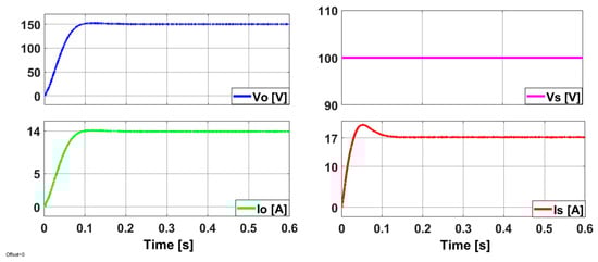 The Matlab/Simulink simulation waveforms for 1 + 2 < D < 1 are shown in Figure 5. The converter efficiency is again 98%, and the switching frequency is f = 10   k H z .