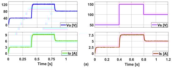 Figure 16 depicts the dynamic response of the DSSB input/output voltage and current waveforms for a variable step response of the input source voltage using the parameters listed in Table 6. Figure 16b displays a compressed timeline of the output voltage and the current transient response to demonstrate the time specifications and requirements of the response, and Figure 16c is used to demonstrate the effectiveness of the current-mode controller based on small-signal analysis.