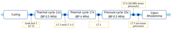 - Thermal (heating–cooling) cycling. The hot water injected in the inner casing had a temperature of 80 °C, while the cold water had a temperature of 20 °C. This process of alternating between hot and cold water was repeated for a certain number of cycles. Following the thermal cycles, a leak test was performed.