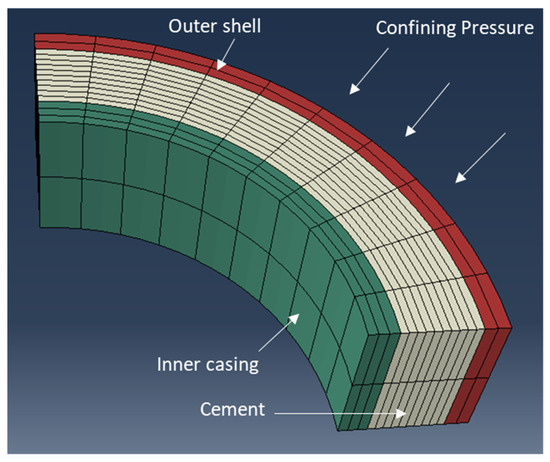 We developed a hydromechanical model to investigate the evolution of stress in the cement sheath in the test setup. The modeling is conducted using the Abaqus finite element package. The model mimics the same geometry as the test setup presented in Figure 1. Cement is modeled as a poroelastic material. The initial pressure of the cement was assumed to be equal to the curing pressure. The hydration rate of class G cement was used to estimate the water consumption, pressure drop, and stress change in cement during curing [10,11]. After curing, the model imposes a cyclical temperature or pressure boundary condition on the inside of the inner casing. The evolution of cement stress is monitored over time to understand the impact of pressure and temperature on the stresses in cement and whether damage can be expected. Details of the modeling methodology are described in Moghadam and Loizzo [11]. Figure 3 provides a schematic of the geometry that was considered in the modeling exercise.