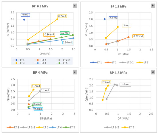 The plots of flow rate vs. ΔP from all leak tests are presented in Figure 4, grouped by the BP. The slurry had shrunk by 4.1% during curing. This value is similar to existing data for neat cement [12]. The flow rate measured just after curing (LT 1) was relatively high, as shown in Figure 4a,b, equivalent to an effective of 4 mD. This indicates the potential formation of a microannulus after curing.