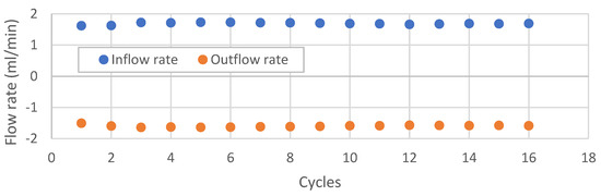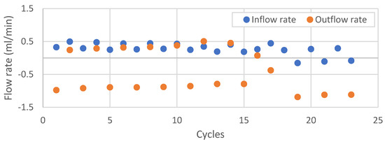 Inflow and outflow rates after each cycle of thermal heating–cooling performed at a back pressure of 4 MPa and differential pressure of 1 MPa. Lost data communication in cycle 17 (omitted from graph). The positive sign means flow into the sample, and the negative sign means flow out from the sample.
