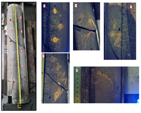 Visual observations of one side of the cement sheath using the UV light at different locations from top to bottom (indices 1–5). The dye traces (yellow) indicate the leakage pathway. The big cracks pointed out by the star sign are the artificial cracks created when removing the sample.