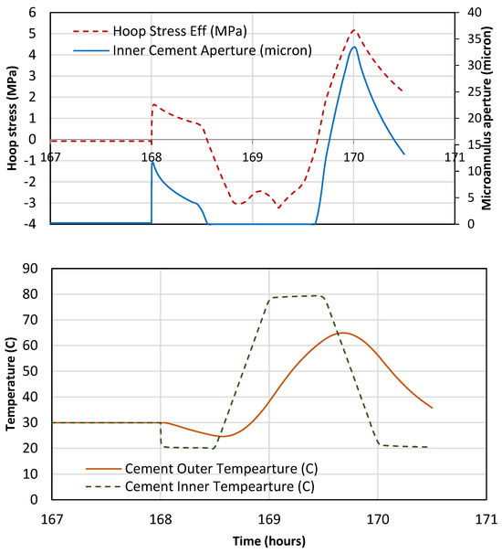 Cement temperature, hoop stress, and microannulus size during the temperature cycles.