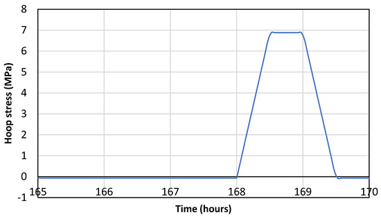The magnitude of the hoop stress (tangential direction) during a pressure cycle between 0 and 30 MPa in the inner casing as performed in the experiments.
