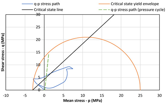 In order to assess the cyclical stress damage, the stress path at the cement (inner side) is plotted for both the pressure and temperature cycles in Figure 10. The initial size of the yield envelope for cement is also plotted in Figure 10, along with the critical state line [14]. Both the pressure and temperature cycle paths are largely within the elastic region. This indicates no shear failure under the lab conditions. However, cyclical damage may accumulate at levels below the shear capacity. The stress path for the temperature cycles varies over a wide region. Part of this region exceeds the yield envelope on the “dry side” (to the left of the critical state line). This typically leads to dilation and shear cracks and may lead to permeability. However, no significant permeability gain was observed in the lab tests. Based on the present model, it is not clear whether the cyclical damage accumulates or plateaus when a high number of cycles occur.