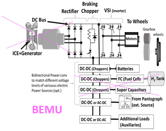 The investigated BEMU is designed, starting from the features of the Hitachi Masaccio train (Masaccio is the name of the HDMU version) [26,27] and some recent developments of Staedler trains [28].