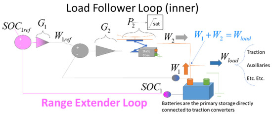 The internal load follower loop (controller G2) is not able to stabilize the state of charge of the battery SOC1. An external loop called the “Range Extender” stabilizes the battery’s state of charge, regulating the desired power flow W1ref.