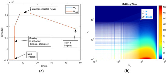 In the hypothesis of constant W1ref, it is possible to evaluate the frequency response of W2(s) as a function of Kp and Ki: relatively low values of both gains (Kp = 10 Ki = 1) can assure stable behavior of the system and ensure it is performing. Figure 4a shows an example of the simulation where a sudden transition from the maximum traction level to the maximum service braking is simulated. The difference between the power required by the traction system and the response of the loop in terms of the power collected by the pantograph is negligible. Higher gains are possible. In this work, a low gain calibration was preferred to ensure a robust solution.