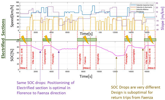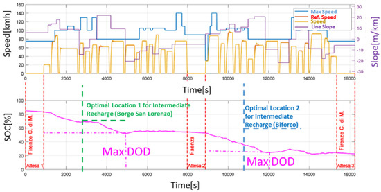 This value of DOD is equal for the two unelectrified sections, so for this motion sensing, the proposed layout of the line is optimal with respect to the features of the chosen train.