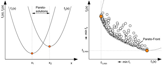 When choosing the appropriate algorithm, the specific properties of the algorithm as well as the specifications of the optimization problem must be considered [9,12]. In application-related problems, multi-objective optimization tasks are the most common. In contrast to the single-objective optimization, several objective functions are optimized simultaneously. Usually, these functions are in conflict with each other. As a result, there is no solution where both objective functions reach their individual optimum [9,13,14,15]. This context can be described by the so-called Pareto front (see Figure 1). Illustrated are the two fictitious objective functions and , which are to be minimized by a variation of . By using the single optima ( and ), three characteristic ranges can be identified. Whereas an increase of in the range leads to an improvement of both functions, an increase for causes a deterioration of both functions. The relevant range is thus located between the two individual optima (). Within this range, an improvement of one objective function can only be realized by a deterioration of the other criterion. This means that there is no longer a single optimum, as in the case of the single-objective optimization. Instead, there is a set of different optima, also called the Pareto-optimal set or Pareto solutions. By comparing the two objective functions, this set can be represented as a subset of the boundary curve (Pareto front on the right). By selecting a weighting, a problem-specific overall solution can then be determined [9,13,14,15].