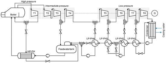 In order to validate the implemented workflow, an optimization run is performed using an example model of the open-source library ClaRa [30]. The chosen model represents a coal-fired power plant with eight turbine stages including feed water preheating. Figure 3 shows a simplified schematic of the plant. After passing the boiler, the generated steam flows through the individual turbine stages until it is expanded to the condenser pressure. The collected condensate is then preheated by the four low-pressure preheaters (LP-PH) before it enters the steam-heated feed water tank. The feed water is preheated by the high-pressure preheater (HP-PH) before it enters the boiler. The power plant is designed to provide 580 MWel. In the simulation scenario, two load reductions to 70 percent load are performed. One simulation run of 10,000 s requires around 118 s simulation time.