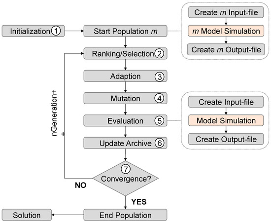 After initialization of the simulation model, a start population of the size m is generated (Step 1). Therefore, m modified input files are created, and m respective simulation runs are performed. A dominance-based ranking system is used to assign a corresponding fitness value to each solution, which are extracted from the m output files (Step 2). The iteration loop starts after the assignment process is done by using adaption (e.g., crossover or swarm movement) and mutation methods. The additional designs must be evaluated and ranked once more (Step 5). Therefore, new model simulations are required. Beneficial solutions are used to update the archive (containment for good solutions) and checked for convergence (Step 7). If the convergence criteria are reached, the optimization terminates, and the end population is stated. In the negative case, steps 2 to 7 are repeated until convergence or a termination criterion are reached. Since each evaluation requires one simulation of the model, optimization runtime is highly affected by simulation runtime and the number of total simulations. For a time-efficient optimization, both should be reduced as far as possible.
