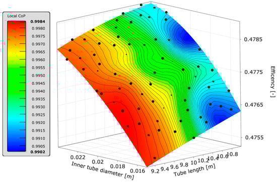Figure 6 shows an example response surface of the overall system efficiency and its correlation to the tube length and the inner tube diameter of the HP-PH. For the approximation, a combination of several approximation techniques such as Kriging or neuronal networks are used. In this case, the color scale indicates the local forecast quality of the approximation. Therefore, the so-called Coefficient of Prognosis (COP) is used. This value is a validation criterion developed by optiSLang to describe the quality of the approximation. It is calculated using a cross-validation procedure [5]. In this case, the COP is on a very high level across the entire surface. In systems with more complex and discontinuous process behavior, lower COP values are generally reached. In such cases, it is possible to use other Design of Experiment (DoE) methods and/or to increase the number of samples (n). Another feature of the SA is the filtering of non-relevant parameters to simplify the optimization problem.