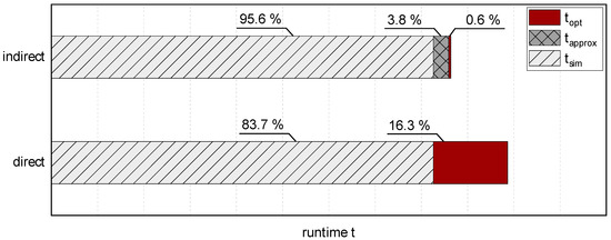 The resulting runtimes of the direct and indirect method are shown in Figure 7. The displayed percentage values describe the share of the respective category in the total runtime of the method. Due to the fixed number of model simulations, the direct and indirect optimization require the same simulation time. Although the indirect variant requires additional time due to the creation of the meta model, the optimization can be achieved significantly faster, because no further time-consuming simulation runs are needed. Compared to the direct method, the optimization time can be reduced by 97% and the total runtime by 12%. With an increasing number of evaluations, this time advantage increases even more. In addition, simulation and approximation are omitted in a new optimization run of the same problem, since the determined approximation is reusable.
