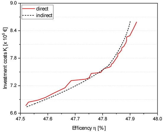 Comparison of the direct and indirect Pareto front of the overall system efficiency and the investment costs of the HP preheater.