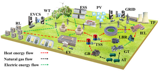 In Figure 1, the gas turbine and energy storage device are used as the connection carriers of different energy sources. The power grid and heat supply network are coupled to optimize and coordinate the production, transmission, distribution and consumption of various energy sources. The power load includes a constant load, interruptible load and time-shifting load, while the electric power is provided by the power grid, DERs, gas turbine and EES devices. The thermal load also includes a constant load and time-shifting load, while the thermal energy is provided by the power grid, DERs, bromine cooler and thermal energy storage devices. EVs are devices that can obtain electricity from power grids, DERs and gas turbines. Considering the randomness and intermittence of the DERs, to suppress their uncertainty, the IES improves the flexibility and reliability of the system by reserving a certain amount of the spinning-reserve capacity from the power grid, gas turbine and EES in advance, which helps the system obtain the maximum benefit.