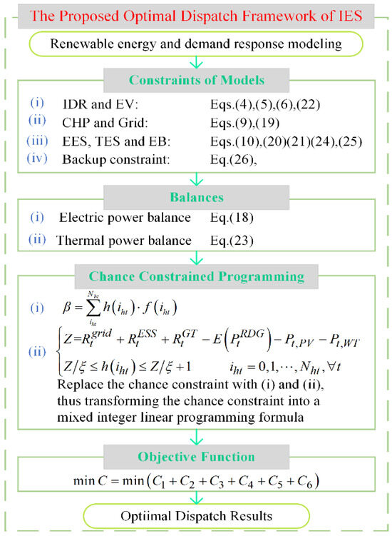 To fulfill the goal of Carbon Peak and Carbon Neutrality, traditional power systems are changing into integrated energy systems (IESs), with a large number of distributed energy sources (DERs) with uncertainties, such as wind power and photovoltaic (PV) power generation [1,2,3]. At the same time, many time-varying loads, like electric vehicles (EVs), also introduce uncertainties into the IES and bring new challenges to its optimal scheduling [4,5,6]. As a supply and marketing system, the IES can couple different energy structures, including electricity distribution systems, gas networks and heating systems. The establishment of an IES in an uncertain environment is crucial to the realization of China’s low-carbon commitment. Therefore, the optimal scheduling of the IES has attracted the broad interest of many researchers and has become a research hotspot [7,8,9].
