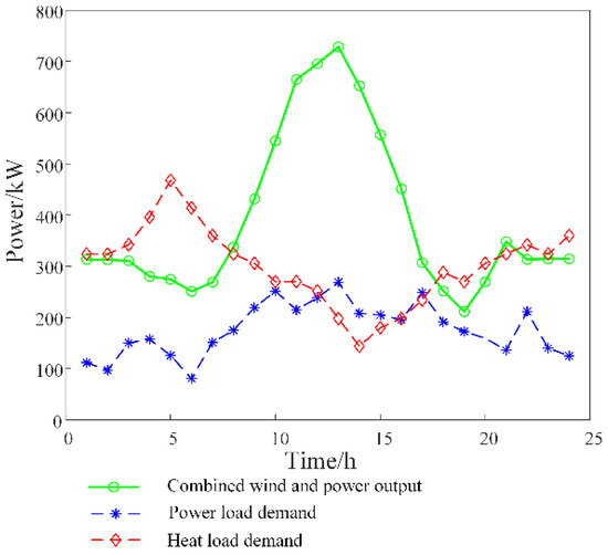 It can be seen that the load has a certain time shift in each period after the demand response, which improves the energy consumption of the system. In Period 13, the initial power load is at the peak, and the total power load increases after dispatching. The reason is that the overall load demand in the system is small and the electricity price is the normal electricity price, so the loads in the other periods are transferred into this period. In Periods 1–4 and 22–24, the load increases after system dispatching because the system energy consumption is at a low point during this period, and the price of electricity is the lowest. The time-shifting loads can effectively reduce the overall energy consumption cost of the system.