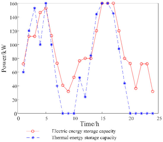 Compared with Scenario 2, Scenario 3 reduces the total operating cost of the system by 198.854, or 14.85%. The carbon emissions are reduced by 217.23 kg, or 65.15%. This indicates that the addition of EES and thermal energy storage can also effectively reduce the optimal scheduling cost of the system. Figure 5 shows the EES and thermal energy storage scheduling scheme of the system in Scenario 3. It can be seen that the EES and thermal energy storage are charged and stored during the load valley, and then discharged and released during the peak load time. Therefore, the energy consumption of the system can be improved by scheduling the EES and thermal storage equipment, which plays a role in reducing the peak and filling the valley.