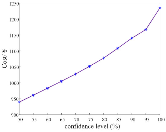 Different confidence levels from 50% to 100% were selected to investigate the impact of the system reserve capacity on the total system operating cost. The corresponding operating costs are calculated and shown in Figure 7. The higher the confidence level, the higher the total operating cost of the system. This is because the increase in the confidence level will inevitably lead to the IES requiring a greater spinning-reserve capacity to maintain the balance between the supply and demand of the system.