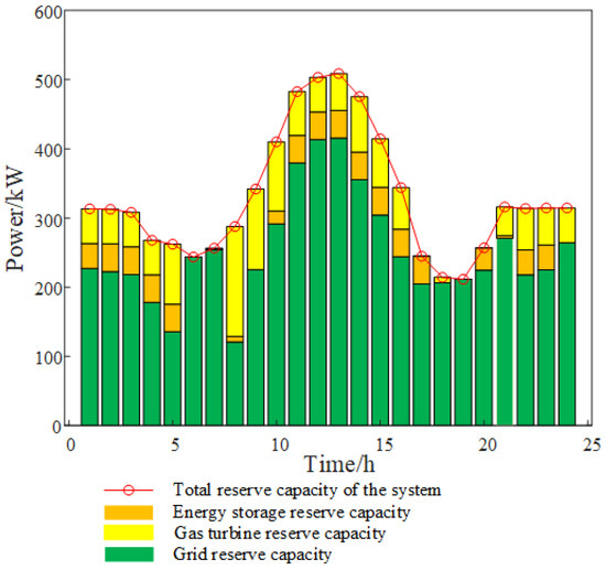 The main reason that the grid owns the largest proportion of the reserve capacity is that the price and reserve capacity price of the power grid are higher than those of the energy storage and gas turbines. When the reserve capacity provided by the internal energy storage and gas turbines of the system is insufficient, the power grid will undertake all the demand for the lack of reserve capacity of the whole system.
