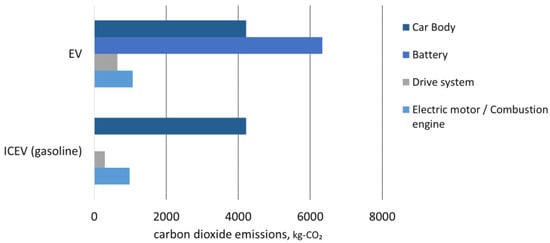 The initial phases of the vehicle life cycle can be described as ‘from-cradle-to-gate’. These are the stages that take into account the sourcing of materials for vehicle components and parts, their manufacture, the assembly of components, and the complete vehicle. Taking into account the extraction of metal ores and materials, the production of parts and components, and their assembly for all vehicle components, excluding the engine and drivetrain, the CO2 emission levels for electric and internal combustion vehicles are similar [13]. A comparative study dealing with the lifetime of electric and conventional VW Caddy vehicles [13], based on the data provided in the Ecoinvent Database, indicates that batteries are the major contributor to high CO2 emissions associated with EV production (Figure 1).