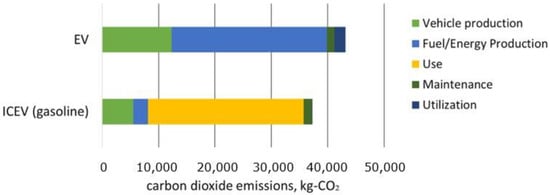 In the production of a complete vehicle, the ICEV has about 60% lower CO2 emissions than the electric vehicle [14]. That is due to the high level of greenhouse gas emissions in the production of lithium-ion batteries, electric traction motors, and electronic controllers. The authors of the paper [15] also noted that EVs display higher mercury emissions in the production stage. It was found that with current technologies, the lifecycle mercury emissions of electric vehicles with a range of 300 miles are 92% higher than those of conventional internal combustion engine vehicles.