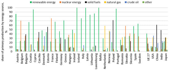 Energy production varies considerably between the EU Member States. Among European countries, there are several countries where the share of energy obtained from renewable sources is very high, e.g., Malta and Iceland—(100%), Latvia (99.5%), and Cyprus (95.9%). Nuclear energy has a high share in France (75.6%), Belgium (70.4%) and Slovakia (58.3%). Electricity drawn from the combustion of solid fuels dominates in Poland at 71.5% [71], Estonia at 55.9%, and the Czech Republic at 44.5%. Natural gas is the main source of electricity in the Netherlands, as it accounts for 58.4%, while in Norway, it is 47%, and in Ireland, it is 41.6%. Crude oil supplemented the energy balance in most countries, including Norway (45.4%), Denmark (34.7%), and Croatia (16%) [70].