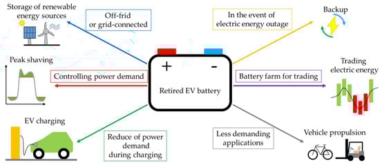 Battery packs recovered from end-of-life electric vehicles can be reused in stationary applications, e.g., as part of the so-called ‘smart grid’ or as energy storage for photovoltaic systems [42,43]. Using electric vehicle batteries to store energy and save energy during peak hours is a strategy that can provide savings for residential users, thereby reducing the load on the electricity grid. Based on an extensive literature review of work on battery recycling from electric vehicles, the authors of the paper [44] concluded that a holistic approach to the integrated assessment of closed-loop and environmental aspects of batteries is, however, lacking. It was noted that in addition to repurposing and recycling, the EV life cycle should also include repair and maintenance, retrofitting, and/or battery reconditioning.