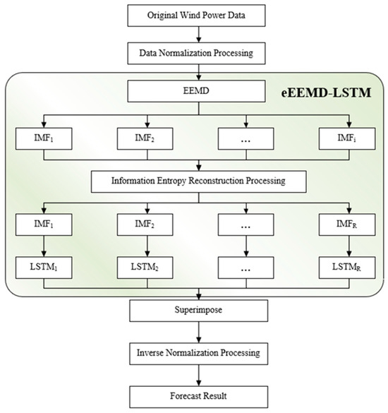 This study provides a detailed introduction to the ultra-short-term wind power prediction method based on eEEMD-LSTM, as shown in Figure 3. This method starts with the normalization of wind power data to avoid possible unit problems in the subsequent prediction process. Thereafter, the complex wind power sequence is decomposed into several relatively simple IMF components {IMF1, IMF2, …, IMFi}, to improve prediction accuracy. Next, the information entropy is used to extract eigenvalues in the sequence to reconstruct the IMF components {IMF1, IMF2, …, IMFR}, which significantly reduces the computational complexity of the model. Then, an error target is set according to the mean value of each reconstructed component. The LSTM network is then inputted separately, obtaining the predicted value. Finally, the predicted value of each sequence is reconstructed to obtain the final predicted results. The final wind power prediction results are inverse-normalized to obtain the actual prediction data, which provides the basis for wind farm scheduling and power generation.