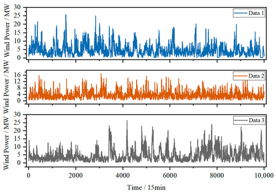 To better test the prediction effectiveness of the proposed method, we use three datasets of actual wind power data from the same wind farm in different periods, which are drawn from different seasons in 2017. The first dataset (data 1) is taken from a total of 10,000 wind power raw data from February 3 to May 19, the second (data 2) is taken from a total of 10,000 wind power raw data from May 19 to August 31, and the third (data 3) is taken from a total of 10,000 wind power raw data from August 31 to December 12. The values of data 1, data 2, and data 3 do not overlap. For every dataset, the sample is obtained from a scrolling window with a window size of 12, i.e., using the past 12 actual wind power values to predict the next one with 15-min intervals. The training set accounts for 90%, and the test set accounts for 10%.