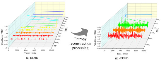 After calculating the information characteristics of each IMF group separately, redundant IMFs are reconstructed based on relevant characteristics. The reconstruction rules are combined with the decomposition method to produce the new eEEMD-reconstructed decomposition method, as shown in Algorithm 2.
