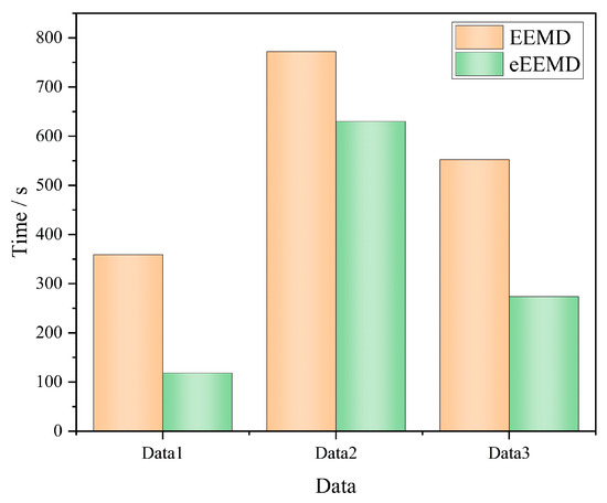 Figure 4 shows the distribution of a single IMFs using EEMD and eEEMD to decompose data 1. The comparison of the two decomposition methods for IMF fluctuation and decomposition shows that the eEEMD is a more effective data decomposition method. By reducing the number of IMFs and alleviating the endpoint problems in the decomposition process, eEEMD can extract time characteristics of data, thereby improving prediction efficiency. To compare the effects of EEMD and eEEMD on the prediction efficiency of the model more intuitively, the decomposition and reconstruction processes of the specific time required for two algorithms. Figure 6 shows the comparison results of the specific time required by the two algorithms. These findings indicate that eEEMD is a superior choice for data decomposition and prediction.