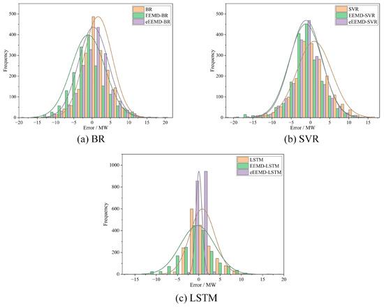 Figure 7 shows the prediction error, which fluctuates around zero. The figure compares and analyzes the frequency distribution of prediction errors for various methods. In particular, Figure 7a compares BR, EEMD-BR, and eEEMD-BR methods, while Figure 7b,c compare the frequency distribution of prediction errors for SVR-related methods and LSTM-related methods, respectively.