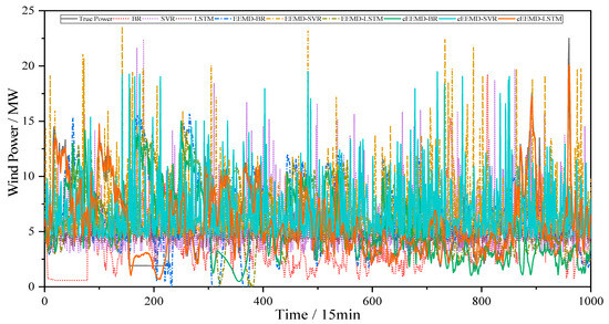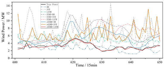 The results of Figure 8 and Figure 9 indicate that the prediction performance of a single model is relatively poor. Among various methods, the fitting curve of the BR model has a large deviation, while the fitting effect of the LSTM model is better. Although the EEMD decomposition algorithm improves the predictive performance of a single model, the overall prediction effect is still not ideal. The combination of the eEEMD method and the model effectively improves the prediction effect, and the improvement effect is more obvious than EEMD. The eEEMD method is implemented in all methods, and the prediction effect results show that the eEEMD-LSTM has the best prediction effect. Additionally, Figure 8 and Figure 9 show the prediction trends for the 9 methods, which are consistent with the overall error variation shown in Figure 7.