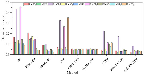 The histograms for the relevant evaluation metrics are shown in Figure 10. In particular, the red column depicts the RMSE1 of nine methods, including BR, EEMD-BR, eEEMD-BR, SVR, EEMD-SVR, eEEMD-SVR, LSTM, EEMD-LSTM, and eEEMD-LSTM, with data 1. Similarly, the green MAE1 and purple columns MAPE1 indicate the MAE and MAPE of each model with data 1, respectively. The yellow columns RMSE2, blue columns MAE2, and pink columns MAPE2 show the relevant evaluation with data 2, while the dark green columns RMSE3, cyan columns MAE3, and orange columns MAPE3 represent the relevant evaluation with data 3. Based on Figure 10, the eEEMD-LSTM, as described in the present study, exhibited the minimum evaluation error, irrespective of the evaluation standard employed.