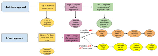 In fact, panel regressions provide better estimation and prediction because they have a double index for their variables: the —index, which shows the cross-sectional dimension, and the —index, which shows the temporal dimension. For this reason, using the panel methodology approach, we can estimate the impact of a single coefficient on the independent variables specified over time and by entity, and determine and estimate these regressors [58]. An additional advantage comes from the fact that the panel methodology can estimate the coefficients in a dynamic and modified way, where they can be controlled by individual fixed effects.