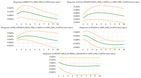 Our model also takes into account the following independent/explanatory variables over the period analysed: the global benchmark price of oil (i.e., Brent crude oil spot prices), domestic gas and oil production per capita, trade dynamics (given by the sum of total exports and total imports), and the trend in the share of renewable energy resources. The mathematical form is presented in Equation (1).In addition, the variables included in the mathematical model used have been selected on the basis of information available in the literature [41,42,43] and are strictly related to the increasing impact and influence of energy prices on the economic growth rate.