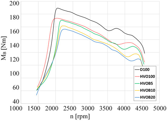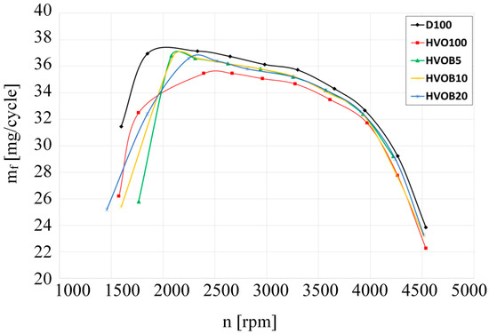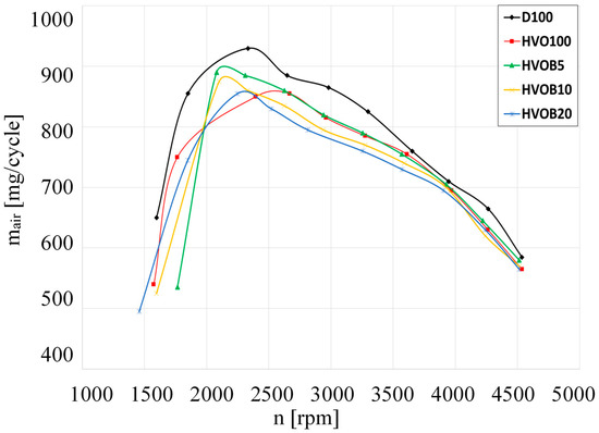 The air mass consumptions for each cycle, denoted as mair, are depicted in Figure 5. The use of D100 fuel resulted in the maximum air mass at a low engine speed of 1500 rpm. After transitioning the fuels to HVO100, there was an observed reduction of around 17% in this value. Additionally, as the concentration of biobutanol in HVO fuel was further raised from 5% to 20%, there was a consistent decrease in this value throughout the different fuel blends. Specifically, the reductions were as follows: HVOB5—18%, HVOB10—19%, and HVOB20—24% when compared to D100. In this particular scenario, the introduction of biobutanol into HVO fuel results in the presence of oxygen alongside biobutanol. Consequently, the resulting mair values exhibit a decrease in comparison to those observed in conventional diesel. When the engine speed reaches 4500 rpm when using HVO fuel and its blends with biobutanol, the observed trend remains consistent, albeit with slightly smaller variations in the drop compared to D100, ranging from 1% to 3.5%.