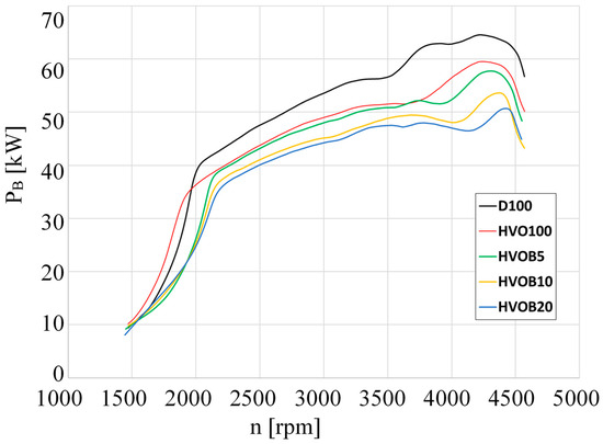 Figure 2 depicts the relationship between engine load and fuel composition across various engine speeds. The conventional diesel engine is capable of achieving a maximum torque of 190 Nm. The use of HVO100 fuel resulted in a reduction of 10% in this metric when compared to the use of D100 gasoline. The gradual addition of biobutanol to HVO fuel, increasing from 5% to 20%, resulted in a consistent drop in torque, with reductions of 11%, 15%, and 18% seen at each respective increment. Figure 3 displays engine power characteristics, exhibiting a similar pattern. The use of D100 gasoline results in a maximum power output of 64.5 kW, whereas HVO100 fuel exhibits a decrease in power output of 8%. Similarly, HVOB5 fuel demonstrates a reduction in power output of 11%, HVOB10 by 17%, and HVOB20 by 22% when compared to D100 fuel. The observed outcomes can be attributed to the reduced lower heating value (LHV) values, as indicated in Table 4 and Table 5. While the lower heating value of hydrotreated vegetable oil (HVO100) is higher than that of conventional diesel in terms of MJ/kg, it is important to note that the density of HVO100 is significantly lower than that of conventional diesel. Consequently, the lower heating value of HVO100, expressed in MJ/L, is lower when compared to D100, HVOB5, HVOB10, and HVOB20. This decrease in value is observed consistently across these fuel types.