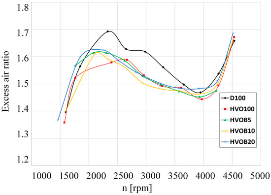 The air intake system of a compression ignition engine functions with an abundance of air, as depicted in Figure 6. Based on the obtained results, it can be observed that at an engine speed of 1500 rpm, the excess air ratio of HVO100 is decreased by 3% compared to conventional diesel, depending on the engine speed. Nevertheless, the introduction of biobutanol to HVO resulted in an increase in the excess air ratio. The addition of biobutanol at a concentration of 5% (referred to as HVOB5) resulted in a 12% increase, while the addition of biobutanol at a concentration of 10% (referred to as HVOB10) yielded a value equivalent to that of D100. Nevertheless, when the concentration of biobutanol in HVO fuel was increased to 20%, it was observed that the excess air ratio value was lower compared to that of conventional diesel, namely at 2.2%. The engine speed reached a maximum of 4500 rpm when using HVO100, HVOB10, and HVOB20 fuels. The air surplus values for these fuels were slightly higher, ranging from 0.6% to 1.8%, compared to ordinary diesel. The value of HVOB5 fuel was 1.2% lower compared to D100. The air-to-fuel ratio parameter determines the concentration of unburned hydrocarbons.