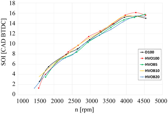 - The Start of Injection (SOI) values exhibit variations across different fuels and mixtures during engine operation at 1500 rpm. The timings for Before Top Dead Center (BTDC) for HVOB5, HVOB10, and HVOB20 exhibit variations of 3.5 CAD, 3.6 CAD, and 1.3 CAD, respectively. Notably, the timing for HVOB20 demonstrates a delay of 1.3 CAD.