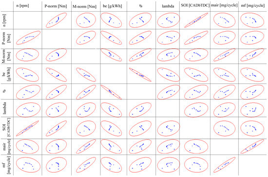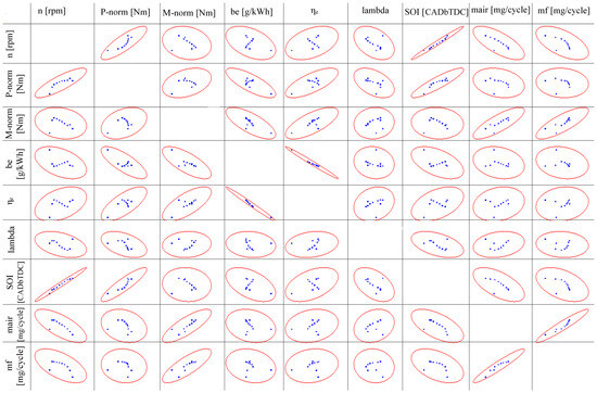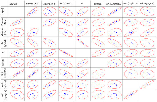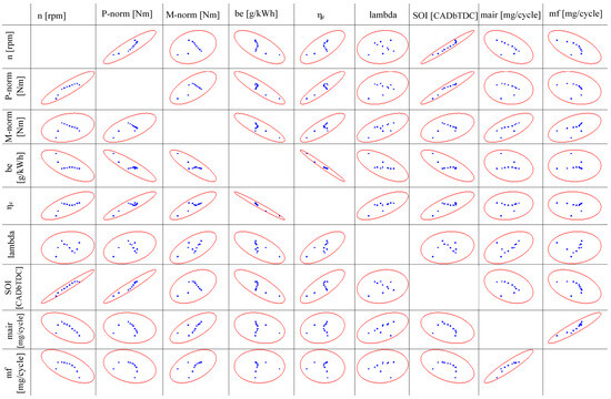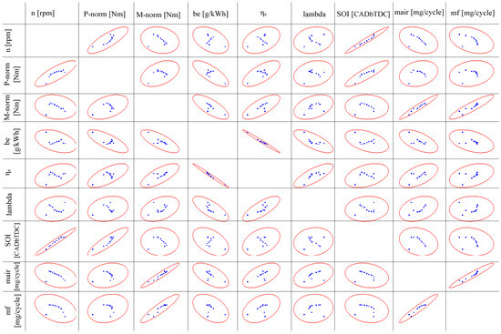 When using various fuel sources, it is crucial to ascertain the parameters of interdependence alterations, which are evident in the correlation between distinct variables. Correlation enables the description of the patterns of co-variation between variables as well as the deliberate justification of the magnitude of relationships between variables. Various types of biofuels and their respective blends were used in the present investigation, alongside regular diesel fuel, which served as a reference for comparative analysis. To expedite the assessment of the impact of fuel type modifications on dependency strength, correlation dependencies were employed. These dependencies are visually depicted in Figure 10, Figure 11, Figure 12, Figure 13 and Figure 14 and quantitatively summarized in Table 5.