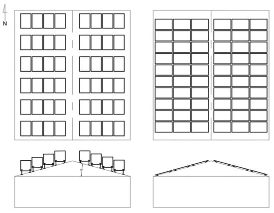 It is very common for buildings to have a north–south orientation. Assuming that these are gabled-roof buildings, it is reasonable to justify the arrangement of the panels in an east–west orientation []. Figure 4 below shows what the alignment of the modules would look like in southern exposure (left side) and east–west exposure (right side).